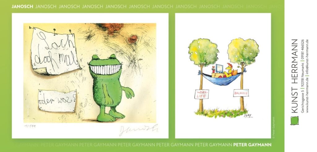 Neben Janosch sind auch weitere Künstler der Galerie erhältlich – Otmar Alt, James Rizzi, Ed Heck, Patrick Preller, Ulrike Langen, Martin Sonnleitner, Peter Wolframm, Max Grimm und viele mehr.